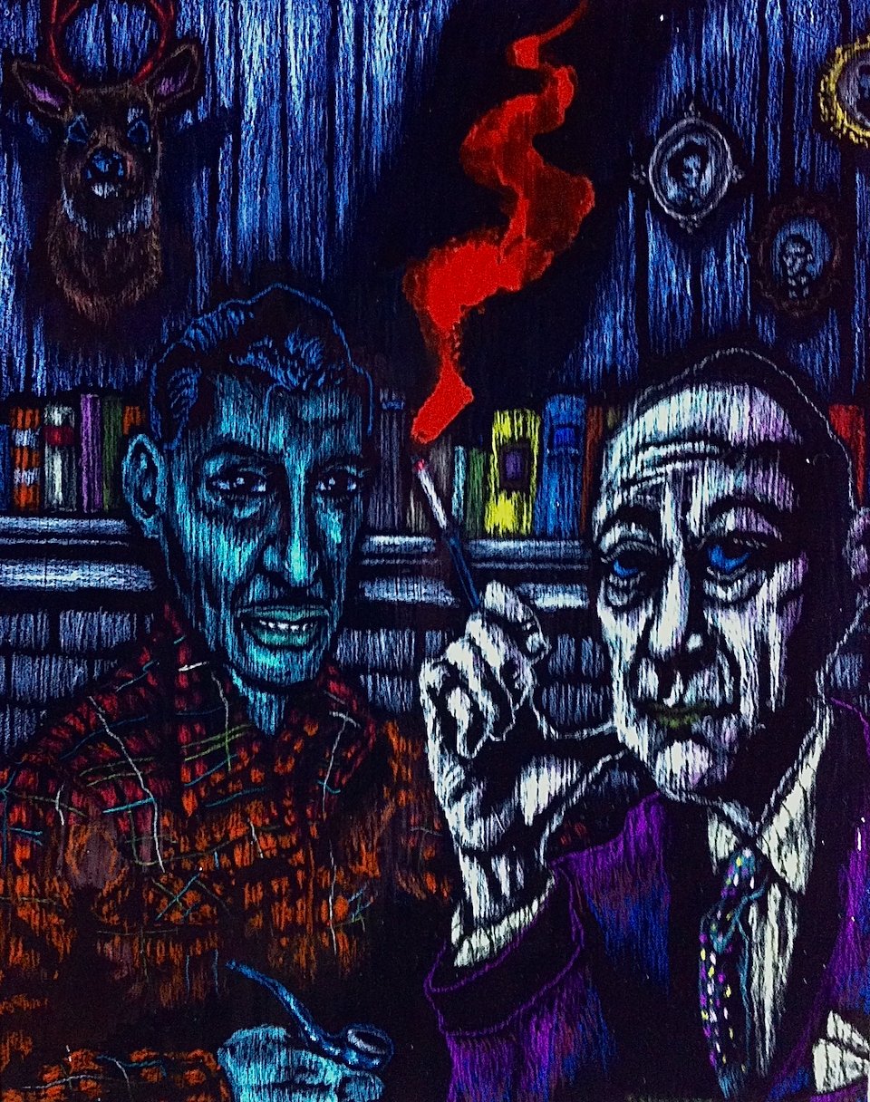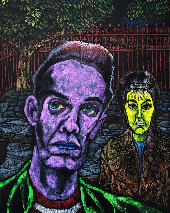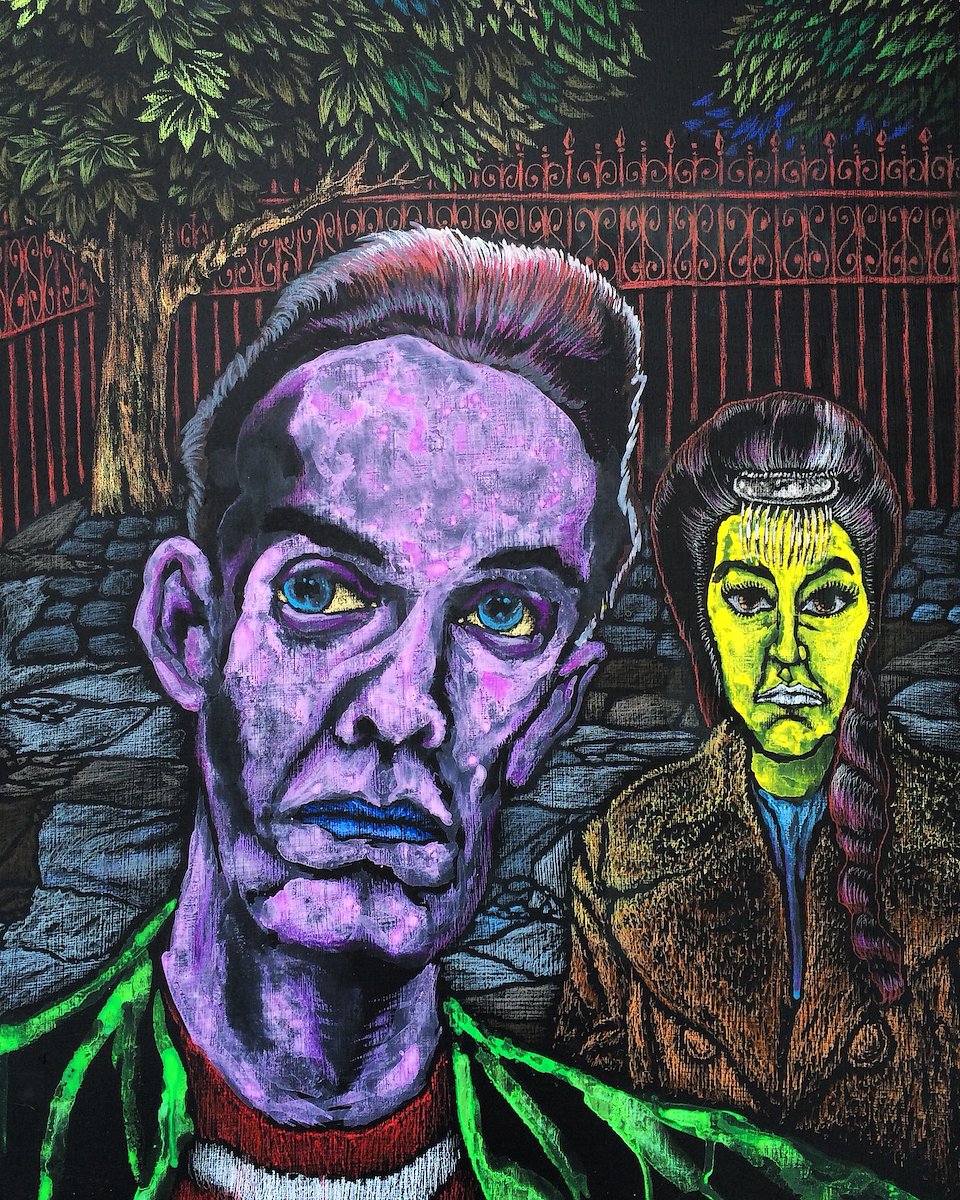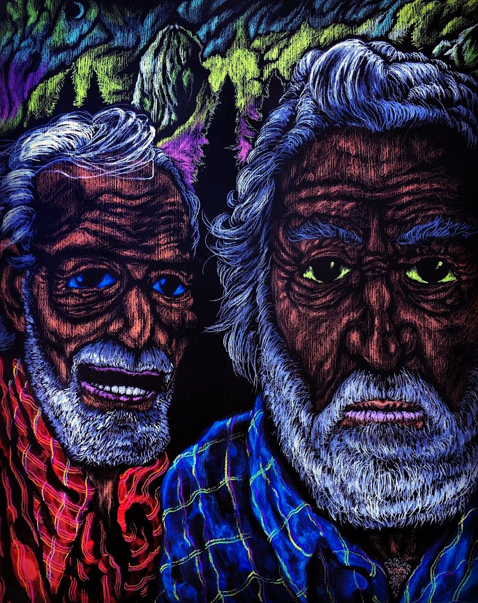 Double Grandpas, gouache, colored pencil, wax pastel, black gesso on panel, 24" x 18", 2016