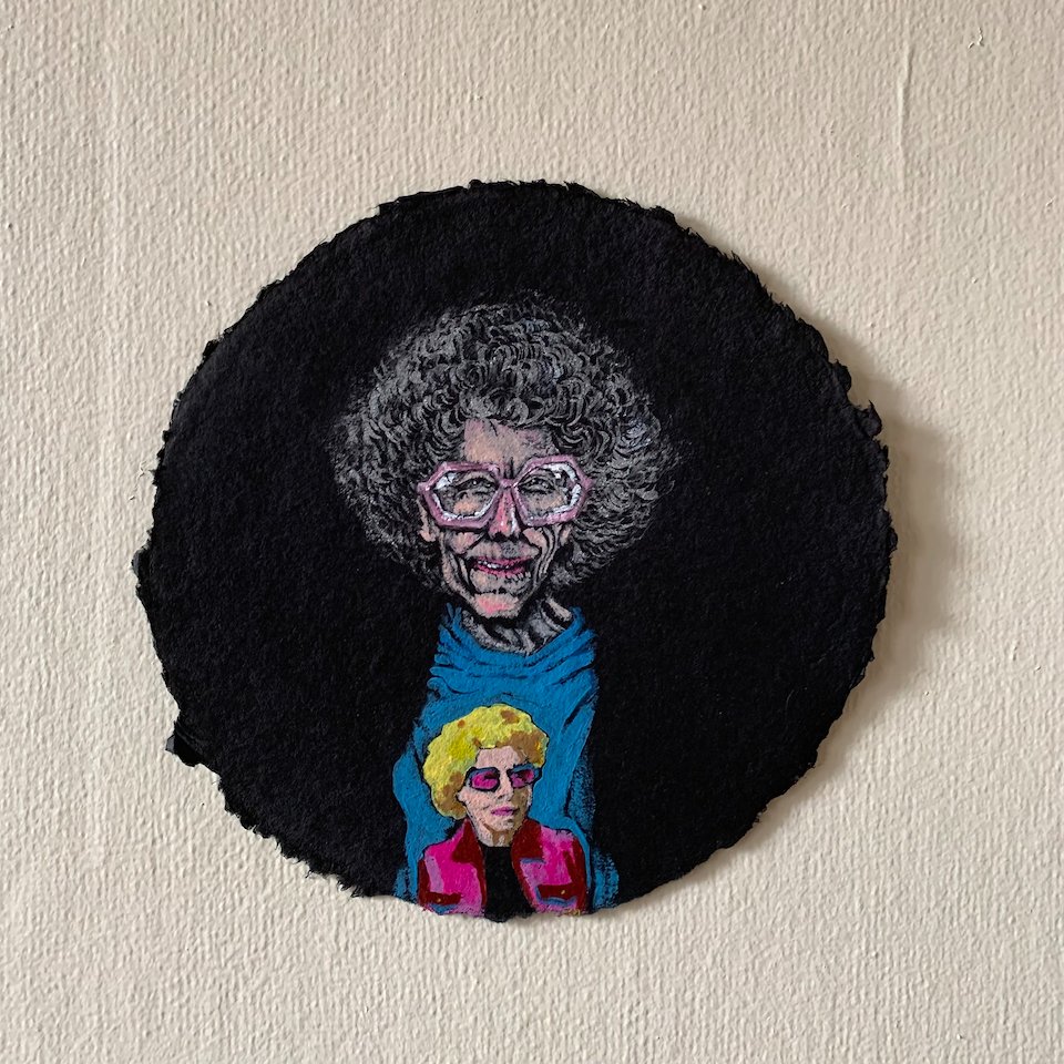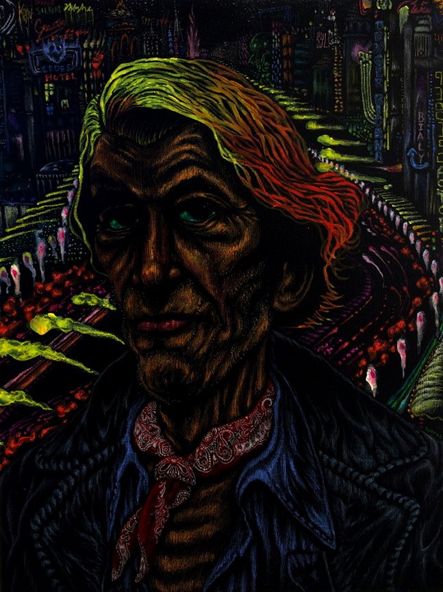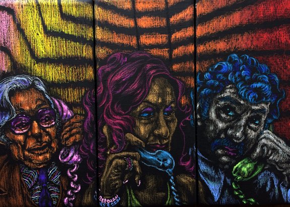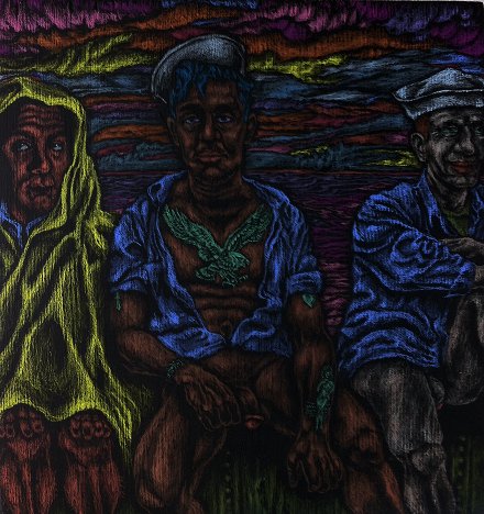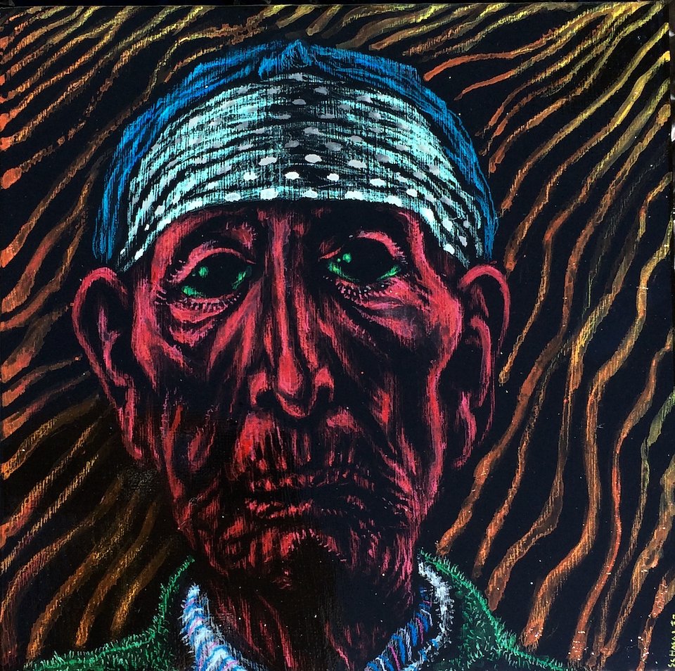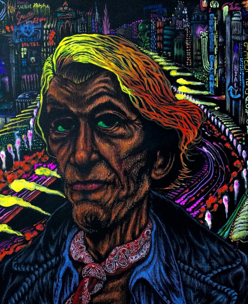 Double Grandpas, gouache, colored pencil, wax pastel, black gesso on panel, 24" x 18", 2016