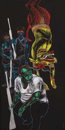 Triumph Over Evil, colored and metallic pencil, china marker on panel, 48" x 24", 2010