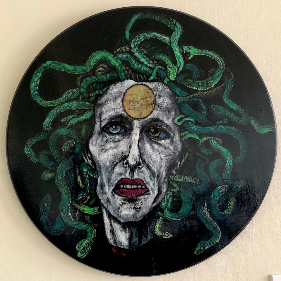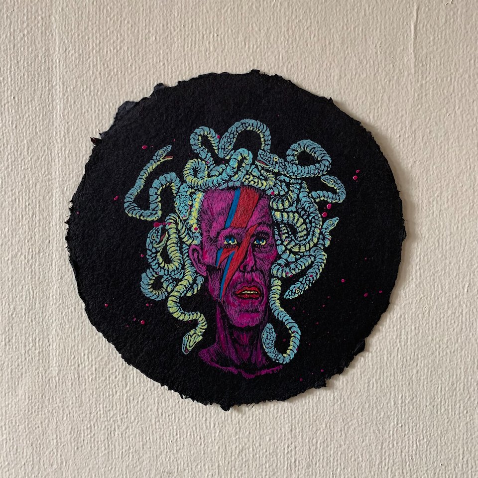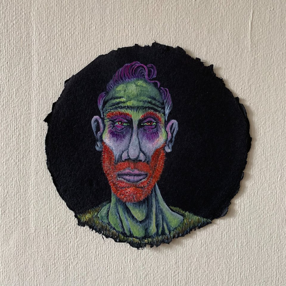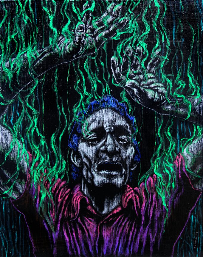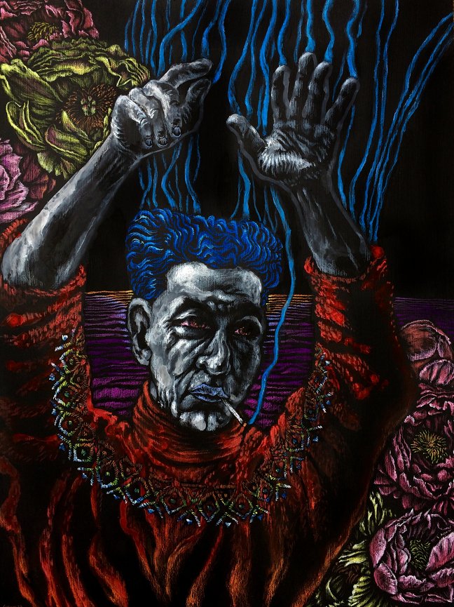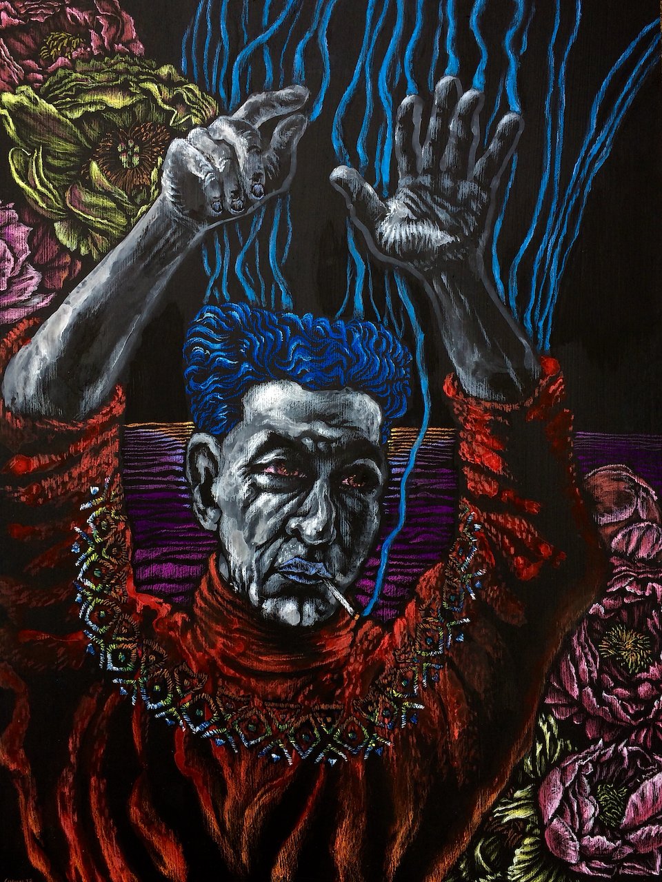 Conjurer, gouache, colored pencil, wax pastel, black gesso on panel, 24" x 18", 2016