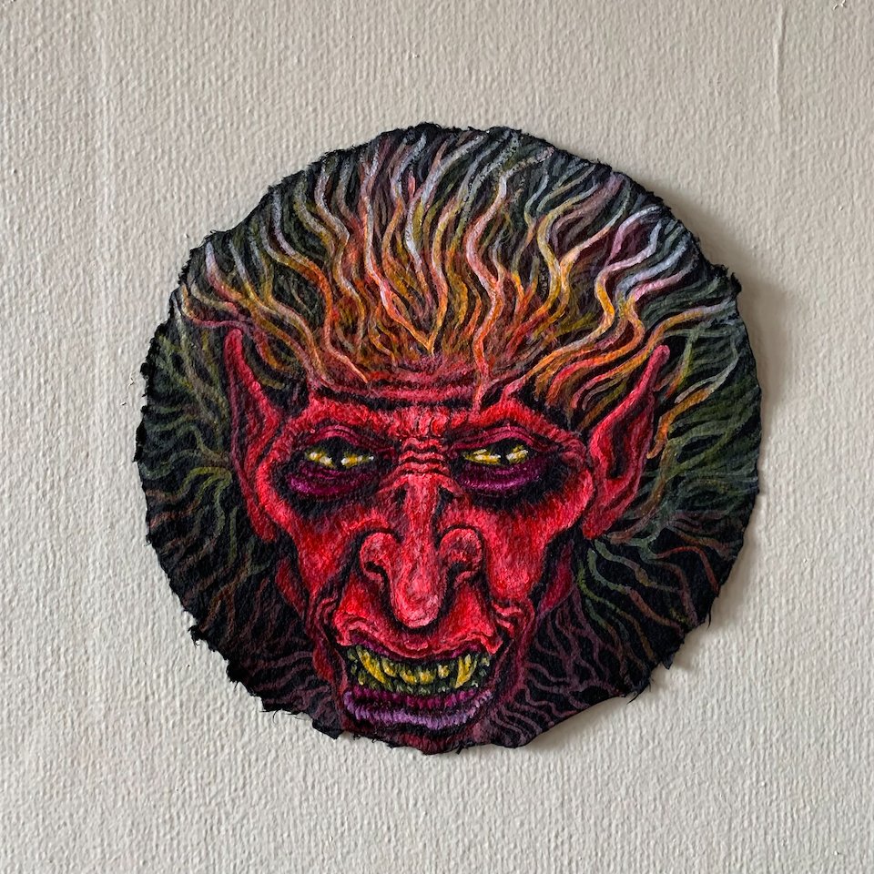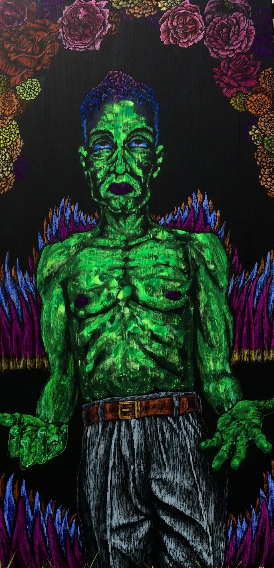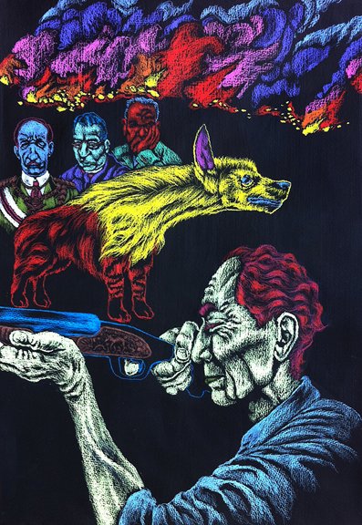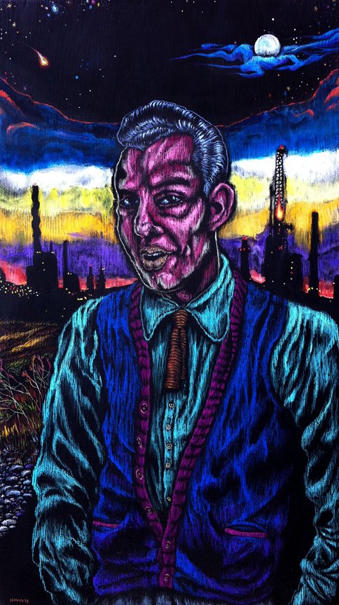 Hellscape, gouache, colored pencil, wax pastel, black gesso on panel, 48" x 24", 2016