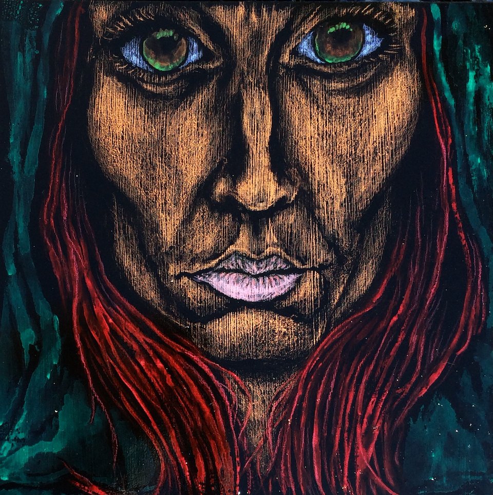 Magic Fire, gouache, colored pencil, wax pastel, black gesso on panel, 15" x 12", 2015
