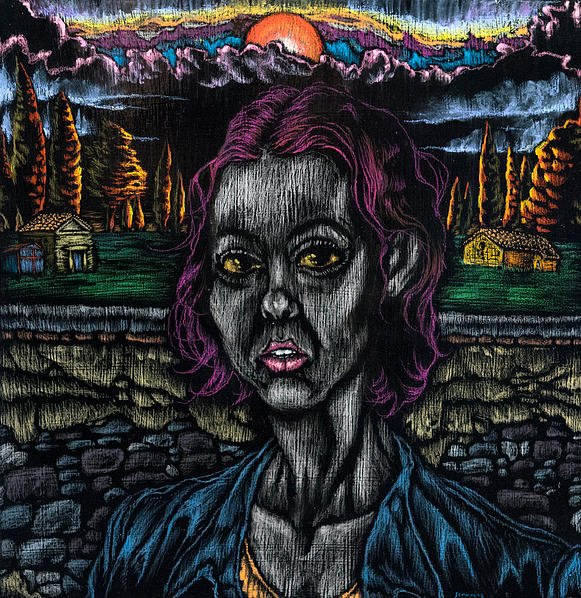 Oblast, colored pencil, wax pastel, black gesso, varnish on panel, 12" x 12", 2013